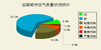 7月7日全國城市空氣質量日報對全國城市空氣質量狀況的檢測結果做了詳細的介紹,其中監測指標為空氣質量指數,即air quality index(AQI)。其中,3.1%的城市為重度污染,6.2%的城市為中度污染,19.3%的城市為輕度污染,62.1%的城市空氣質量為良,僅有9.3%的城市空氣質量為優。