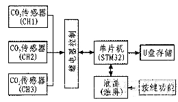 前端傳感器輸出的數(shù)字信號(hào),以串口方式與STM32進(jìn)行通訊,此儀器設(shè)計(jì)三通道采集,利用繼電器電路對(duì)傳感器通道進(jìn)行選擇,STM32將濃度值顯示在液晶屏上,液晶屏帶有觸摸功能,通過(guò)編寫(xiě)液晶顯示界面,調(diào)用相關(guān)按鍵程序,選擇傳感器通道以及保存為U盤(pán)數(shù)據(jù)等功能。框圖如圖1所示。