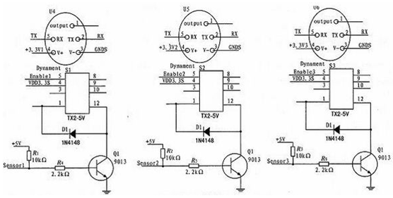 本儀器設(shè)計(jì)3個(gè)通道的二氧化碳傳感器采集,通過(guò)3個(gè)繼電器來(lái)選擇傳感器的通斷。如圖3為繼電器控制電路。